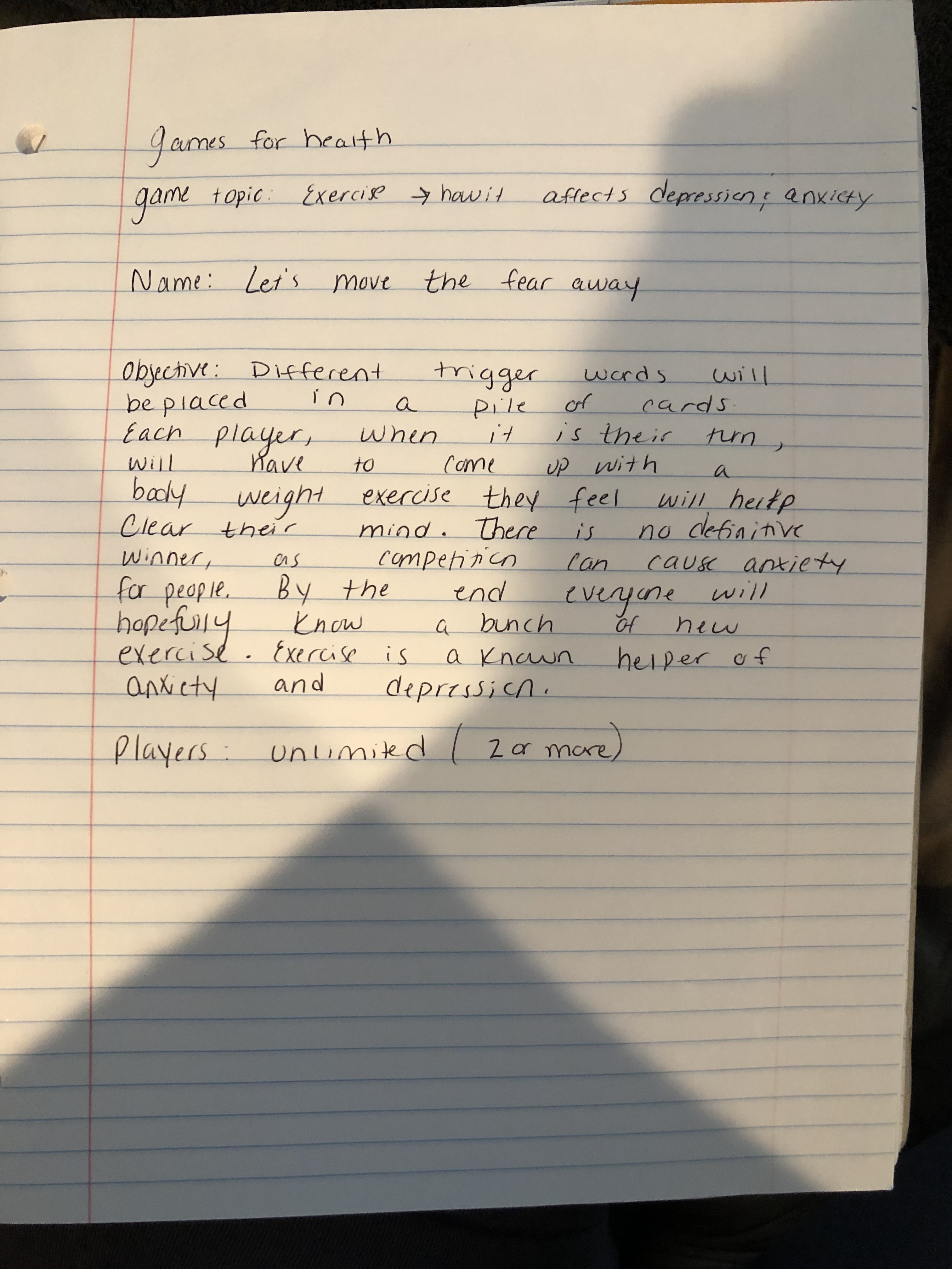 The game I came up with is more of a healthy coping mechanism for those dealing with depression and anxiety. As someone who tends to get down on occasion I find the best remedy is some social interaction and moving my body. Both send off positive vibes to my body and always make me feel better. Below is a rough draft of what I would want my game to be.
