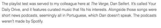 I chose to read an article on how Spotify is testing out podcasts on its platform now, along with music. While Spotify is using some sort of algorithm to do this, and find podcasts based on music choice, there have been some bumps in the road, as any new platform would expect. One was actually kind of funny: