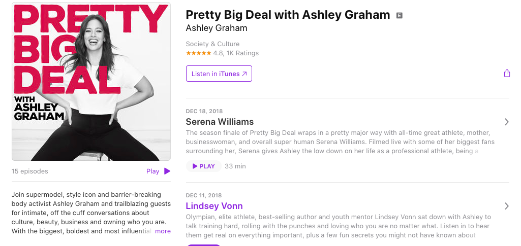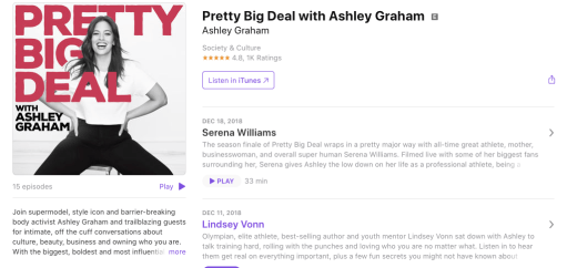 The podcast I listen to is called “Pretty Big Deal” by model and women’s advocate Ashely Graham. She covers a bunch of topics and has a really great way of relating to people and being inclusive of people of all kinds.